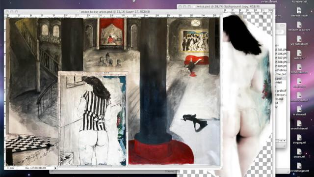 „Peace to our arses...“ (Samuel Becket) Latexdruck / Acryl / Bleistift auf Frontlit PVC, Öl / Acryl auf Leinwand.