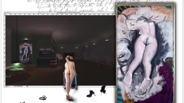 Zweiteilig. Linkes Bild, Latexdruck auf Frontlit PVC, Öl/Acryl auf Leinwand, Videoprojektion. Rechtes Bild, Öl/Acryl auf Leinwand, Videoprojektion. Maße gesamt: 280X400 cm