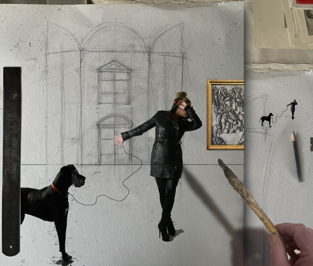 La maison de rendez-vous III. Le chien gardien maîtrisé par une jeune femme. (Der Wachhund von einer jungen Frau geführt.) Digitaldruck, Acrylfarben auf Frontlit PVC. 300x420 cm (HxBr)