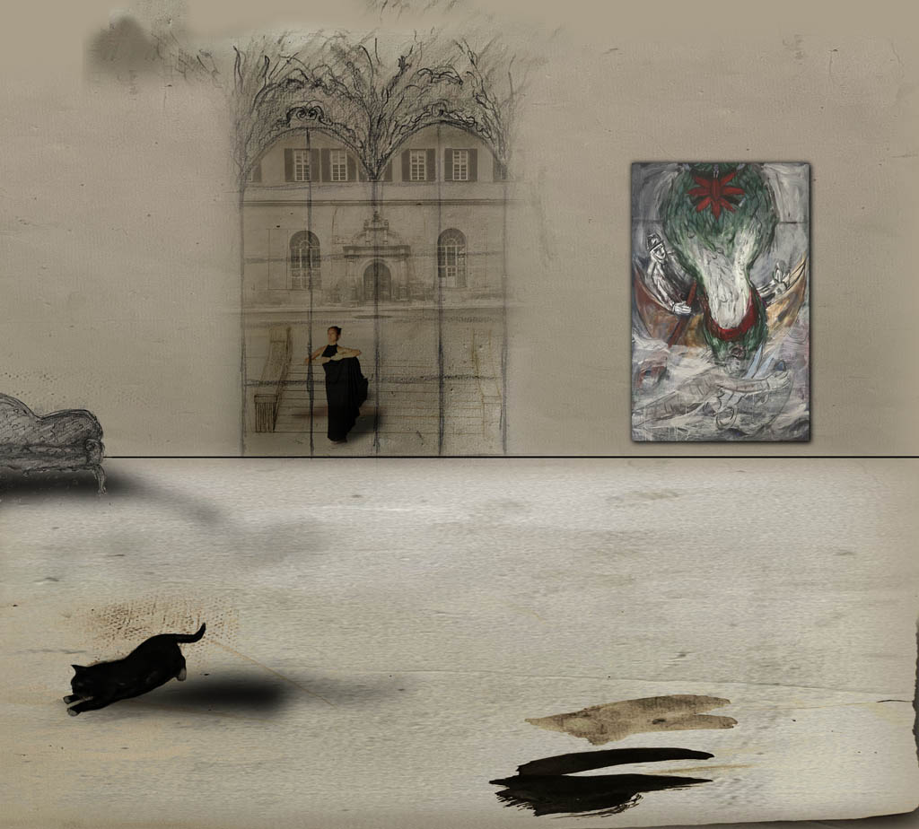 La maison de rendez-vous I. Un départ imprévu. Ein unvorhergesehener Aufbruch. Digitaldruck, Acrylfarben auf Frontlit PVC, Öl auf Leinwand. 300x420 cm (HxBr)